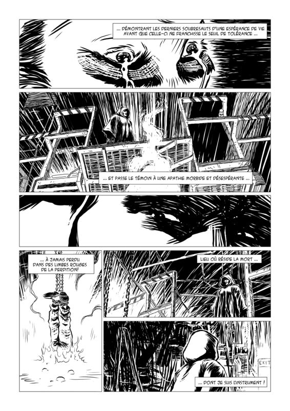En dehors de mes réponses par mail concernant cette planche, un autre truc me chifonne. Les 2 cases des gros plans sur les regards... Bien qu'il y ait inversion j'ai peur que ca fasse surrenchère. Autant le 1er se justifie en rapport avec la Planche 1, le second par contre beaucoup moins. A la limite, la réduire et rendre la case 4 plus grande peut-être je ne sais pas... ou réduire la case 3 et 4 et agrandir les 2 dernières en hauteur... ou mettre la case en dernier. Enfin ca marche tout de même comme ca mais je pense que tu peux l'amériorer d'autant...